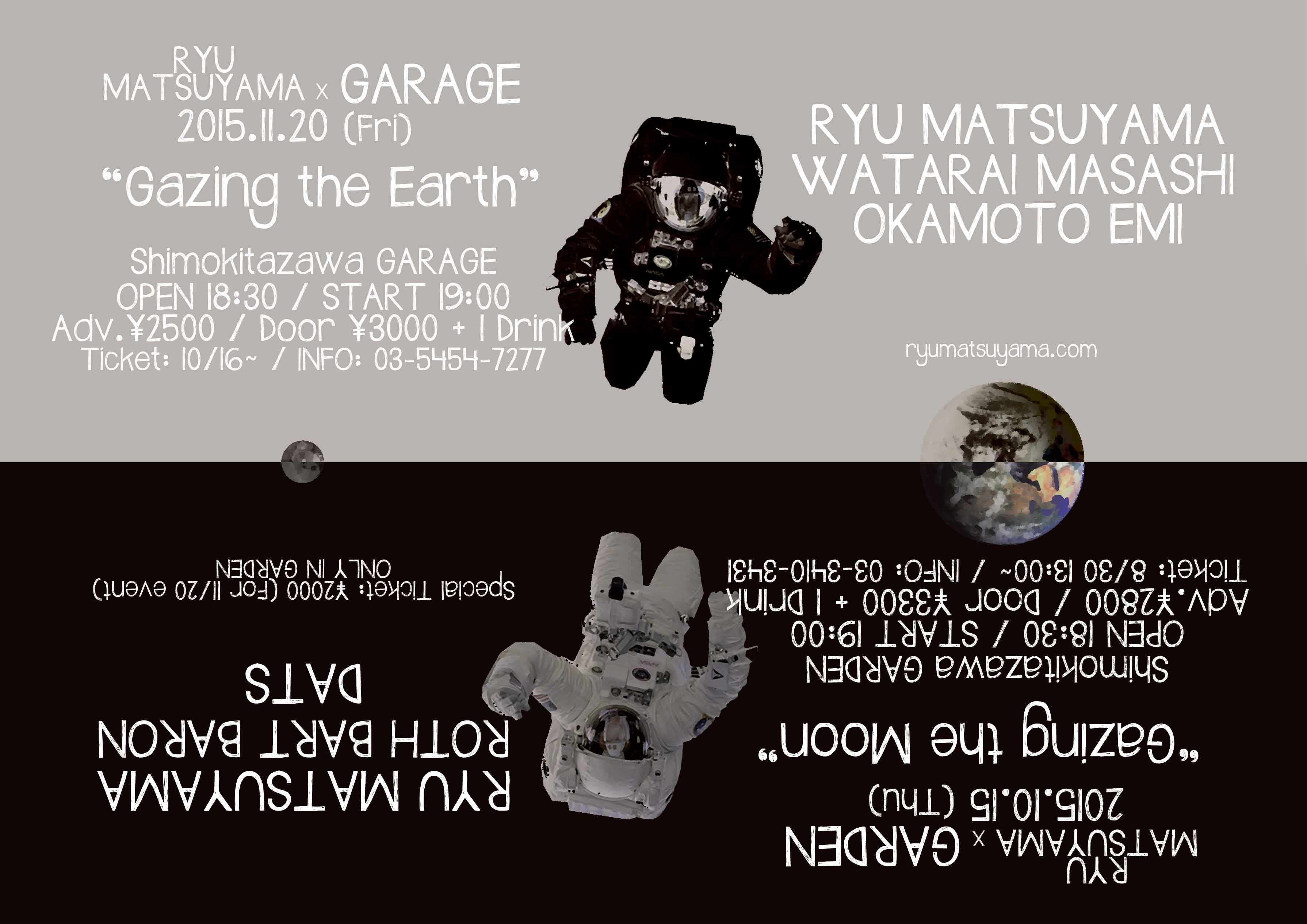 Ryu Matsuyama×GARAGE Gazing the Earth 2015.11.20 (Fri) 下北沢GARAGE open 18:30 start 19:00 Adv ¥2500 / Door ¥3000 + 1D 出演:Ryu Matsuyama、渡會将士、おかもとえみ