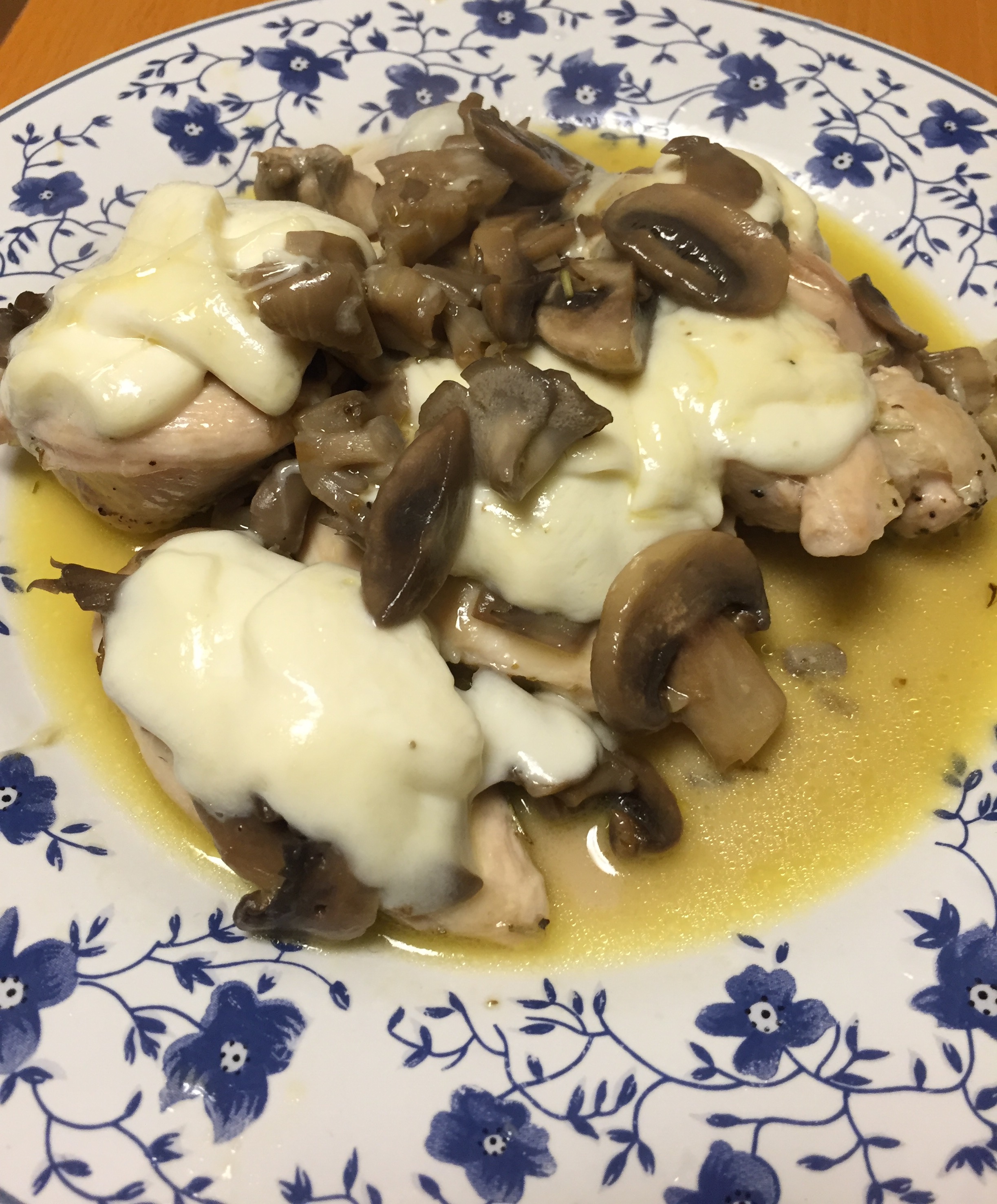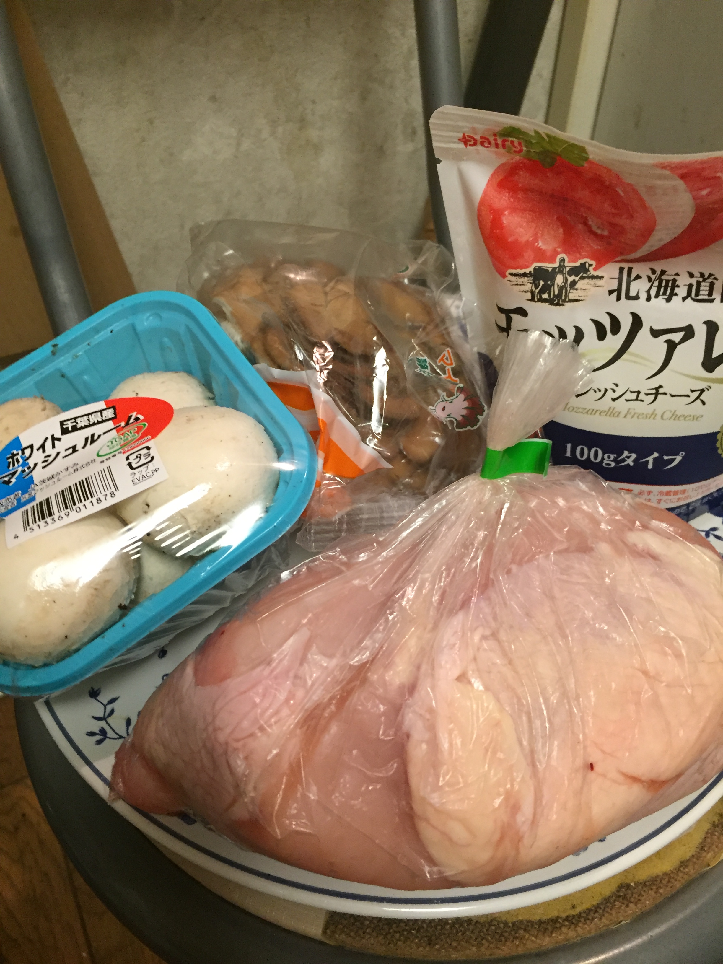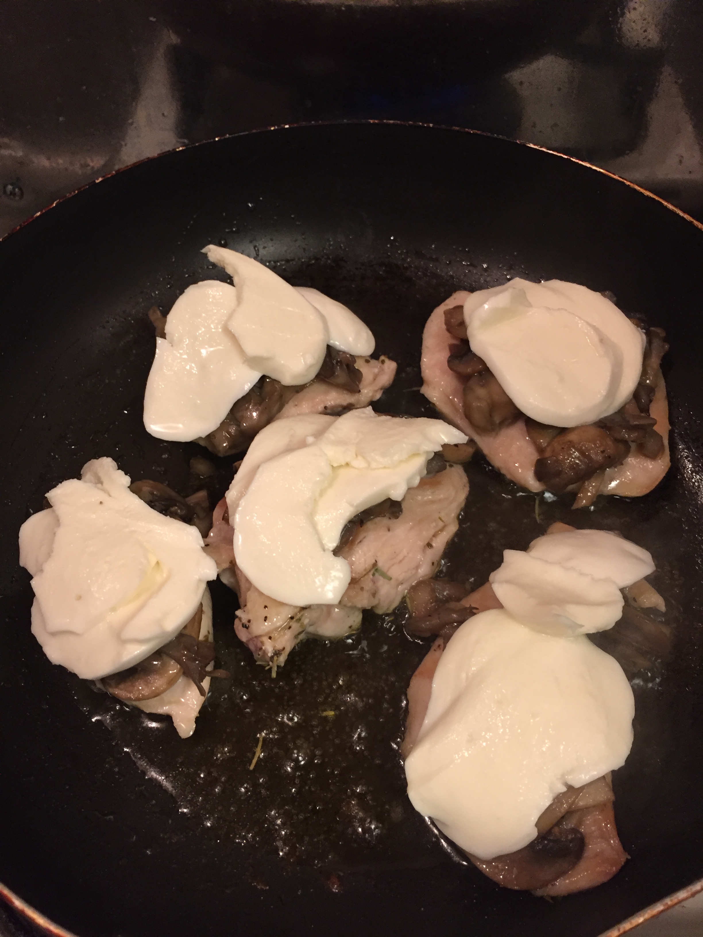 さらに、モッツアレラチーズを鶏肉とキノコの上に乗せます。