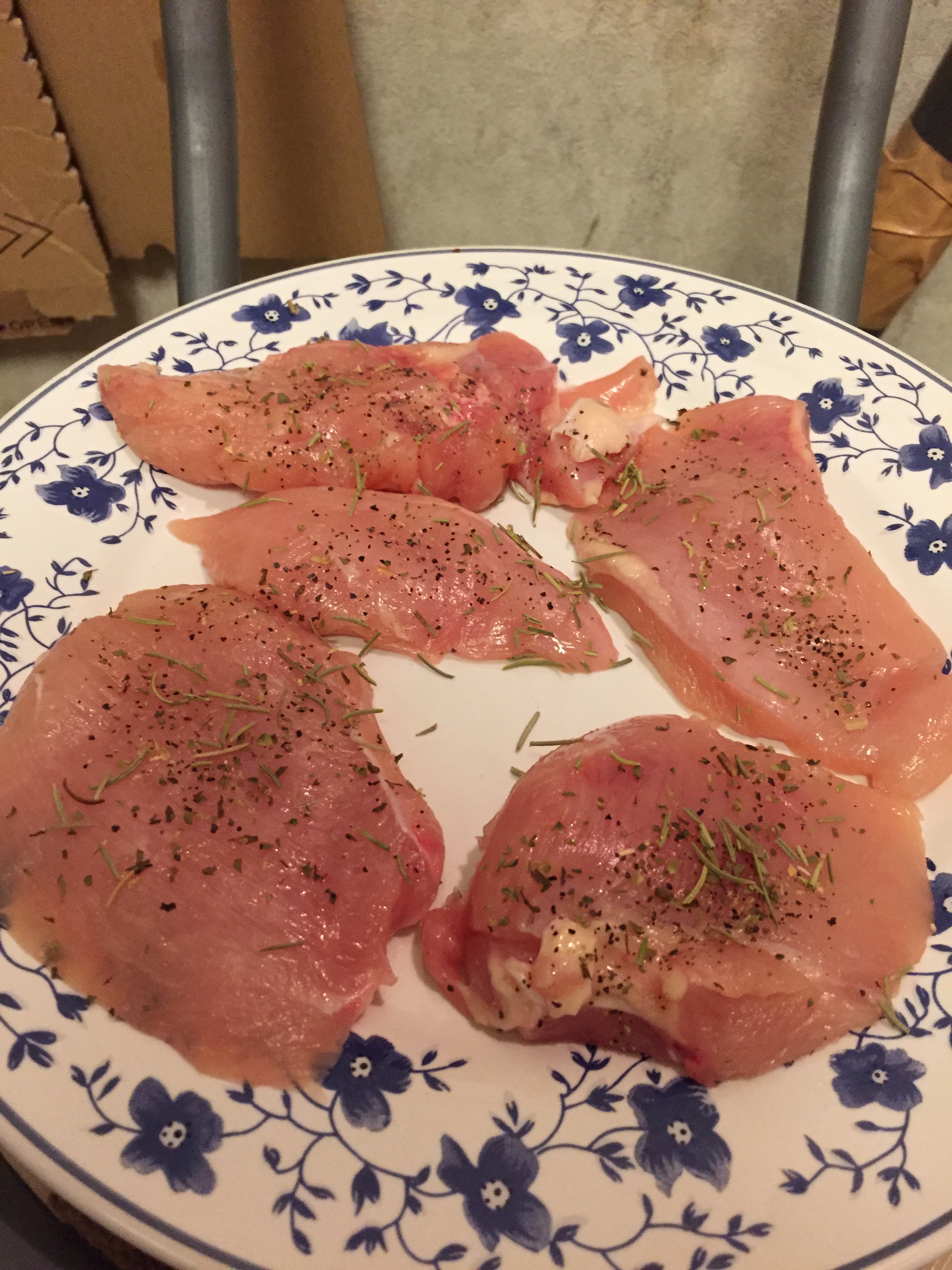 塩、コショウ、さらに乾燥したオレガノと砕いた乾燥ローズマリーをまぶします。
