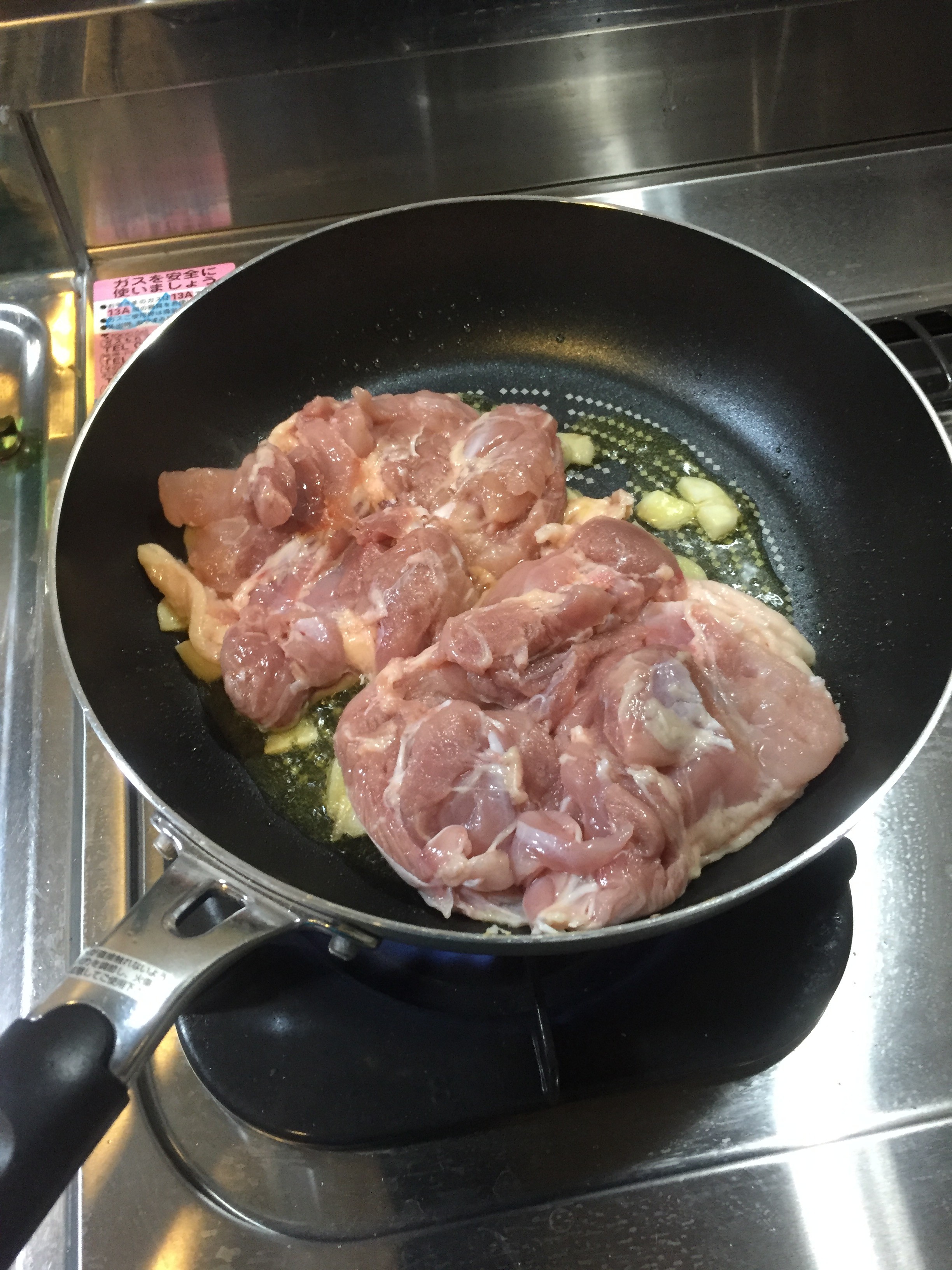 5.先ほど焼いておいた鶏肉とニンニク、