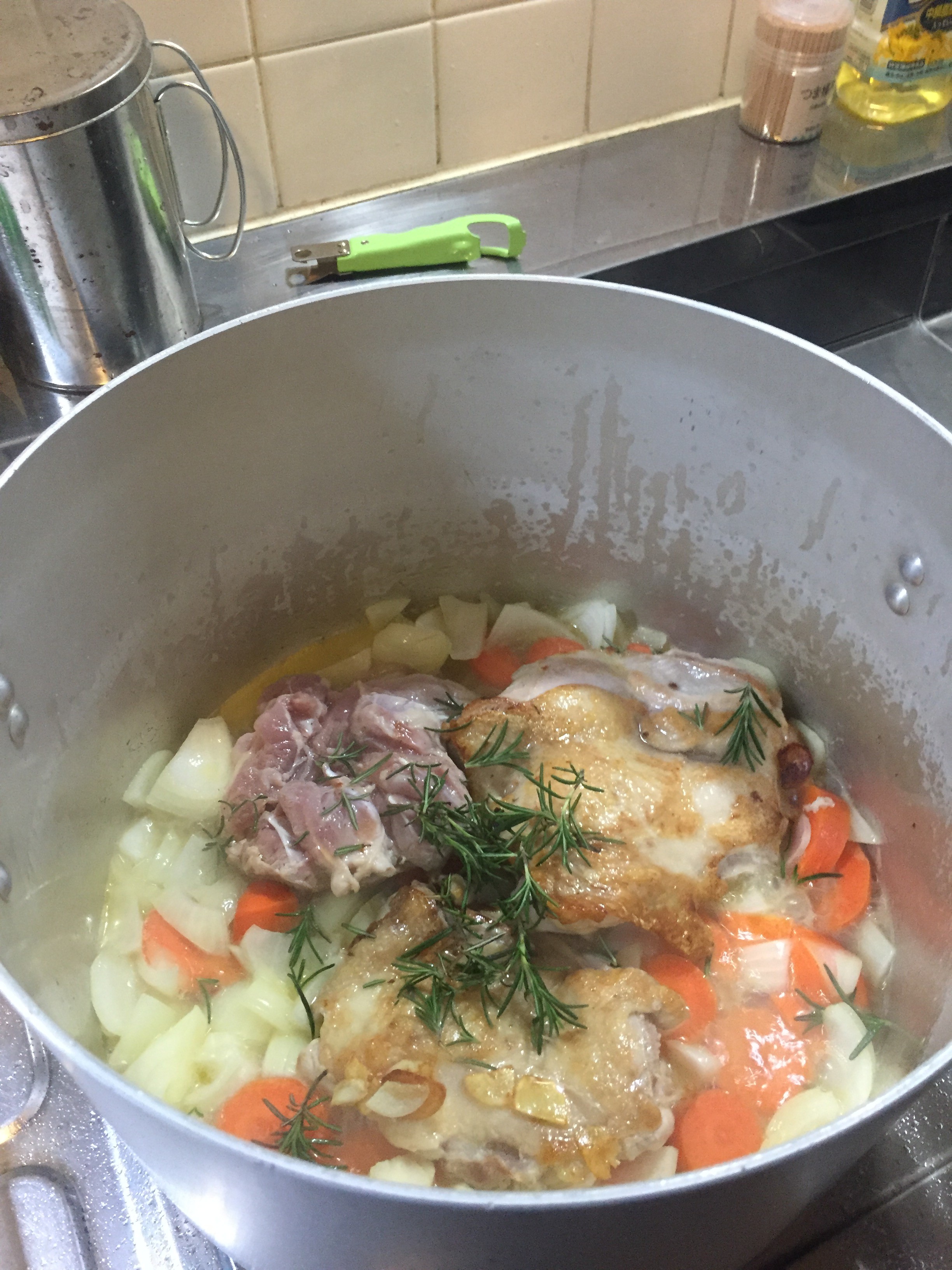ローズマリー適量と塩コショウで軽く下味をして、ワインを2カップ投入する。