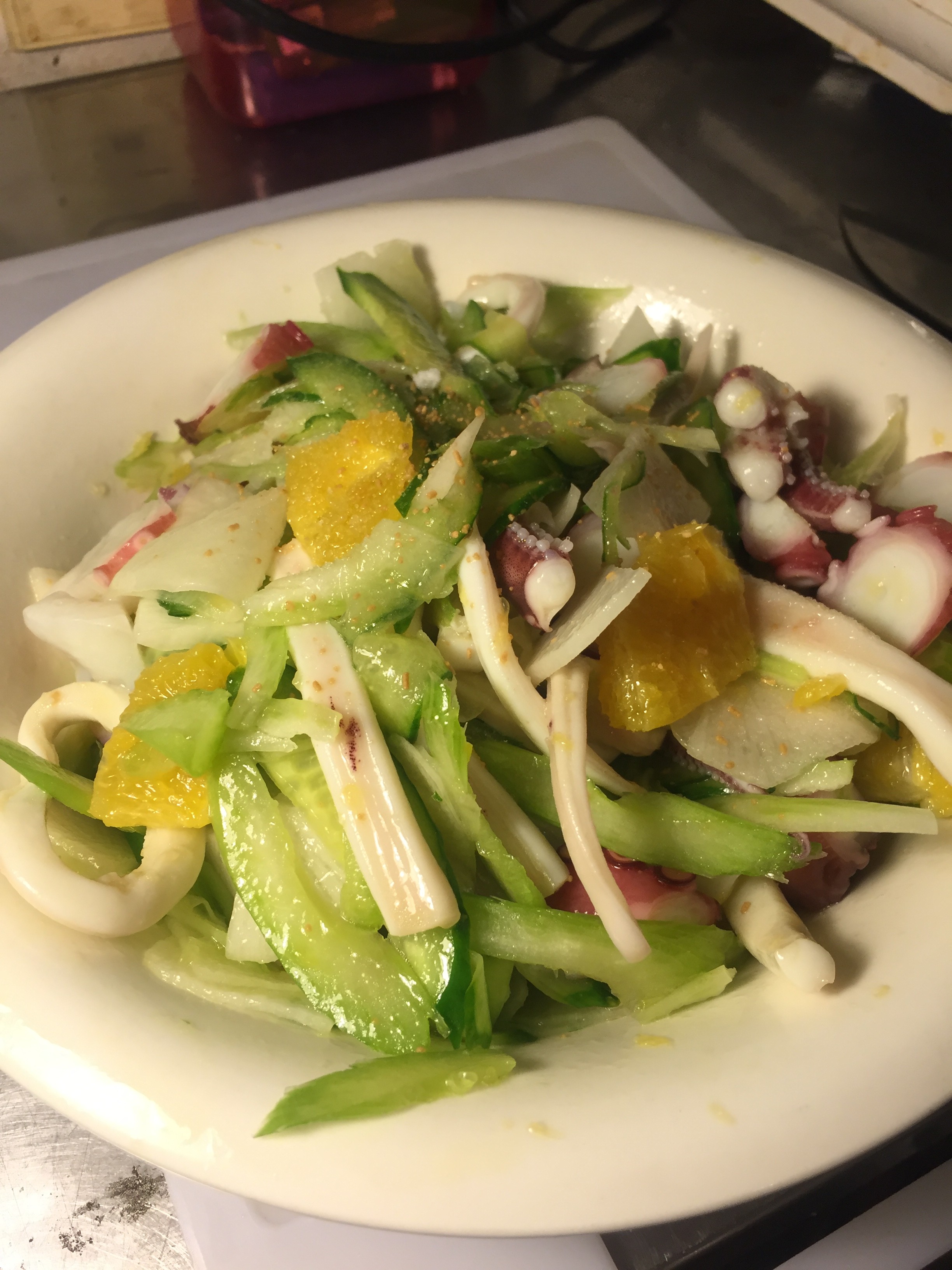 オレンジの甘み、酸味が良い具合にサラダと海鮮に混ざりあい