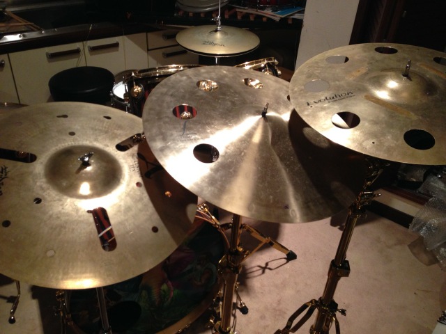 初めて”穴が空いている”シンバルが世に出たのは確か2001年、デイブウェックルというドラマーがセイビアン社からコラボレーションしたEvolution というシリーズのシンバルを出した時だったと思います。Evolution O-Zone Crash という名のそのモデルは、2インチの穴が均等にシンバルにあけられていて、最初にカタログで見たときにUFOのような、近未来感あふれる出で立ちに心を奪われたのでした。O-Zoneはたちまちドラマーの間で話題になり、使用され、現在ではほとんどのシンバルメーカーが独自にデザインした穴空きシンバルがラインナップに並んでいます。