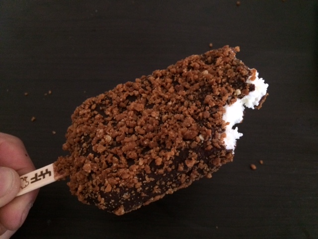袋から出すとアイスの周りのチョコクランチが、ぶわっと飛び散るのも定番ですね。