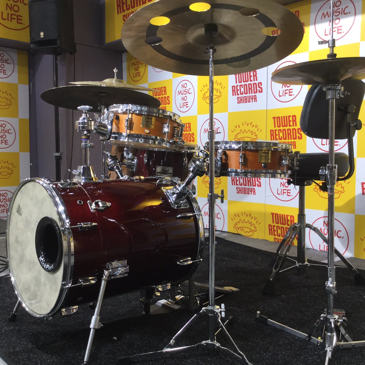 先日、タワーレコード渋谷店でインストアイベントをした際、使用したドラムセットのスネア、そしてタムに彼の10インチと12インチのスネアをそれぞれ使用しました。10インチのスネアをタムホルダーにセットすれば、スナッピー(響き線)をOFFにすればタムとして、ONにすればサブスネアとして、使用できるので、大変重宝しています。何より、重たいスタンドを持っていかなくてもセッティングできる身軽さがあります。また、インストアライブの際は小ぶりながら有能な彼らを、チェックしてみてください。